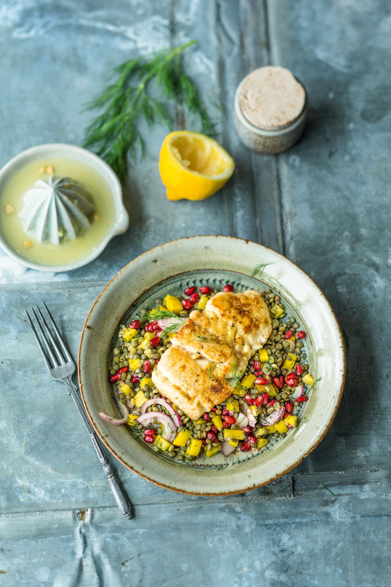 - Die Mango schälen, das Fruchtfleisch vom Stein schneiden und klein würfeln. Die Zwiebel schälen und in feine Ringe schneiden oder hobeln. Den Dill waschen, trocken schütteln, und die Spitzen fein schneiden. Die Linsen abgießen und noch warm mit dem Dressing mischen. Etwas abkühlen lassen, dann die Mango, die Zwiebel, den Dill und die Granatapfelkerne unterheben. Ca. 20 Min. durchziehen lassen.