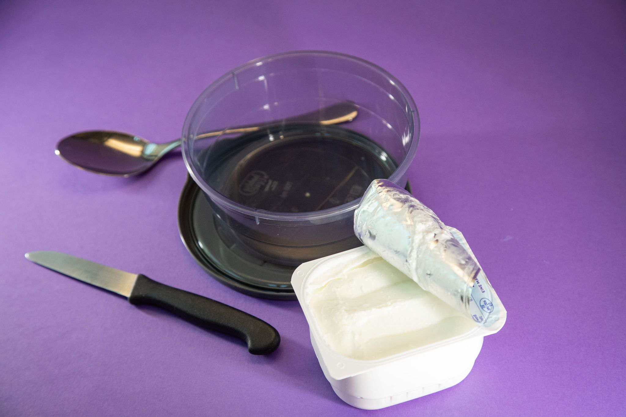 Und so geht’s: Quarkbecher öffnen, umdrehen und mit der Öffnung nach unten über eine Schale halten. Nun mit einem Messer von oben in die Packung stechen und es leicht anwinkeln, solange es noch im Becher steckt.